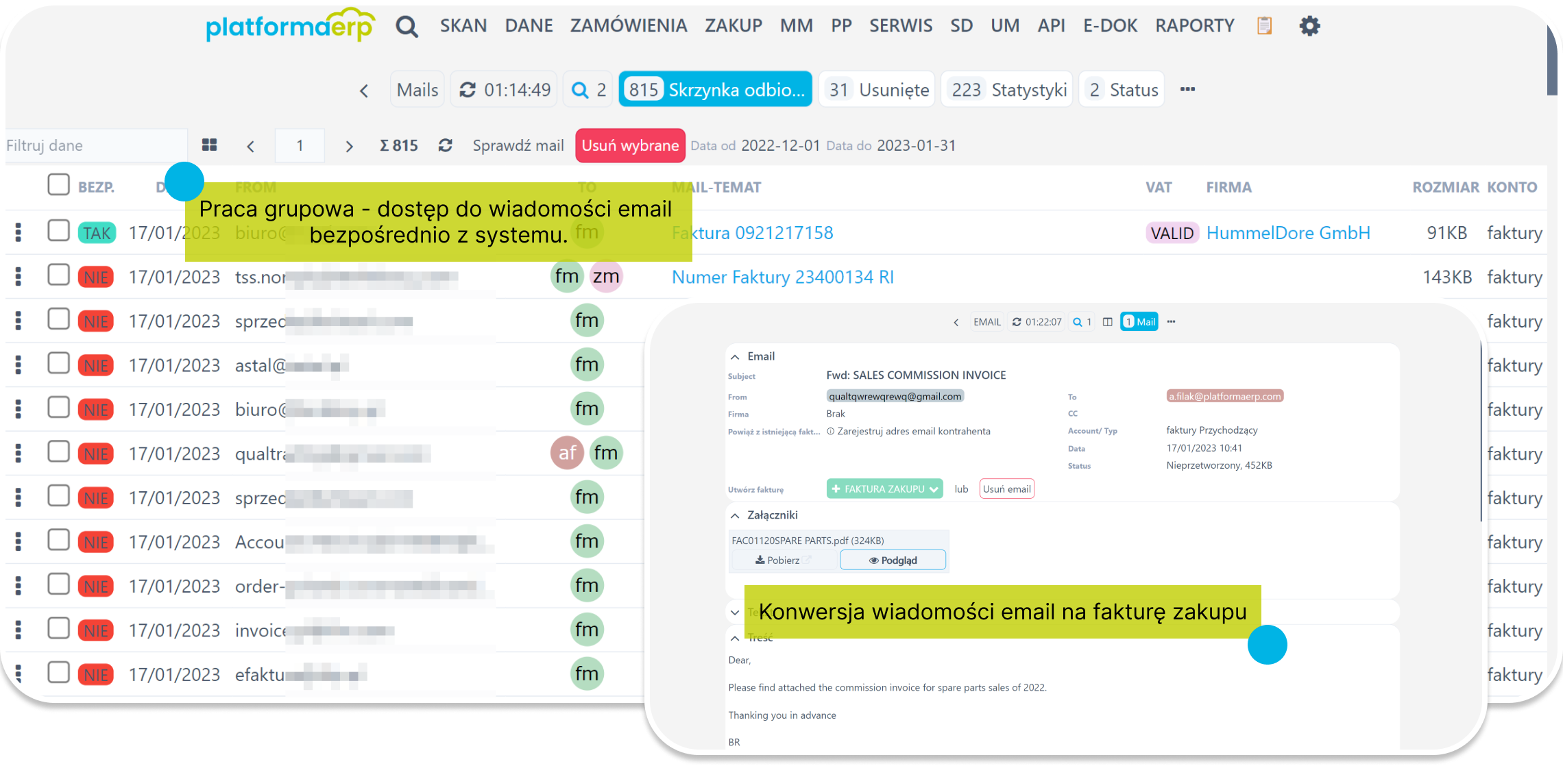 - Bezpieczna rejestracja dokumentów przychodzących - platformaERP weryfikuje adres e-mail nadawcy e-dokumentu, informuje użytkowników czy z danym kontrahentem została podpisana zgoda na przesyłanie dokumentów drogą elektroniczną. Gwarantuje tym samym, że dokumenty zarejestrowane w systemie ERP będą bezpieczne.