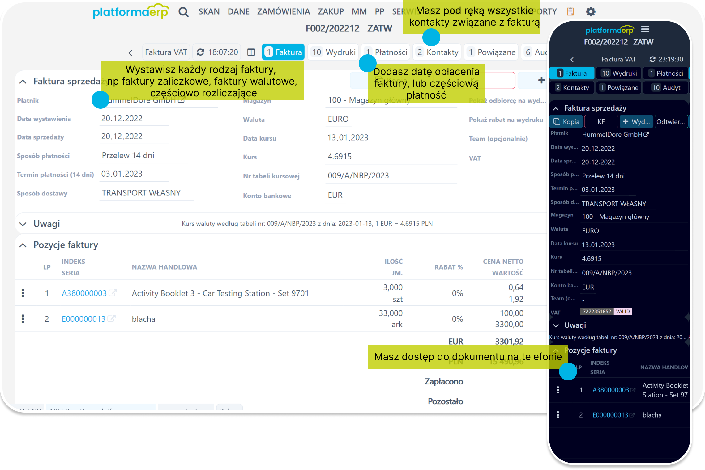 - Zgodność z wymogami KSeF - faktury ustrukturyzowane generowane w systemie platformaERP spełniają wymogi Ministerstwa Finansów.